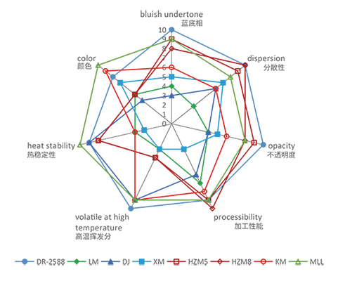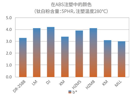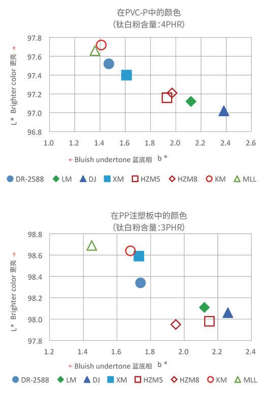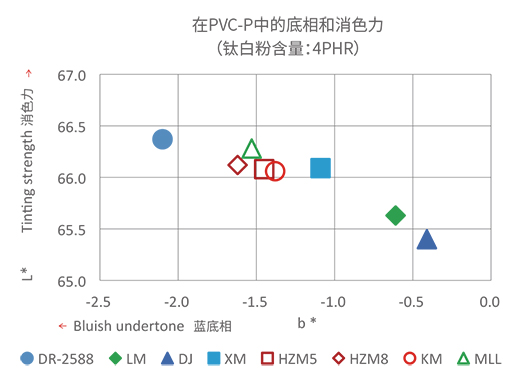 2、在鈦白粉含量為4PHR的含增塑劑和炭黑的聚氯乙烯體系(PVC-P)中測試。