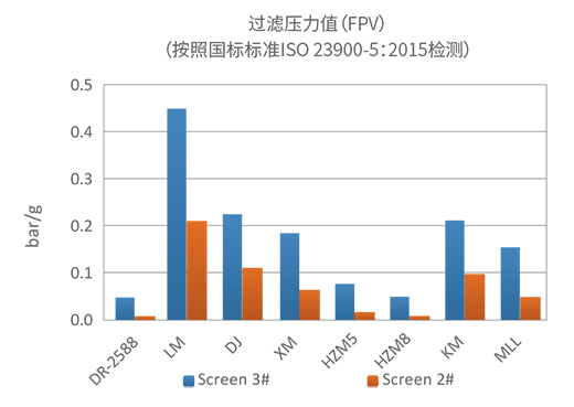 ■ Screen 3#數值、Screen 2#數值分別是指采用符合標準要求的3#過濾網(孔徑約10μm)和2#過濾網(孔徑約20μm)進行過濾測試所得。