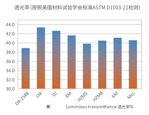 ■ 采用雙螺桿擠出機將鈦白粉與線性低密度聚乙烯(LLDPE)混合制成70%濃度的色母粒,然后將色母粒與低密度聚乙烯(LDPE)混合在吹膜機上吹成鈦白粉含量為8%、厚度為20um的薄膜,按照美國材料實驗學會標準ASTM D1003-13檢測透光率。
