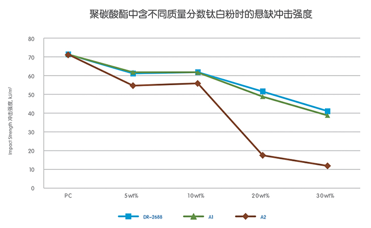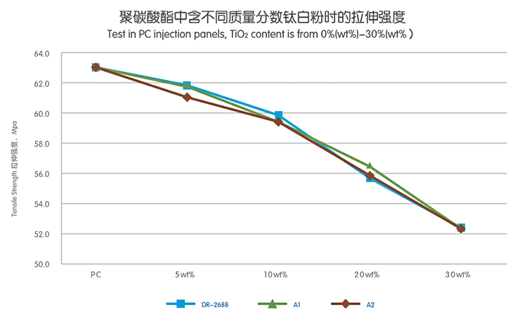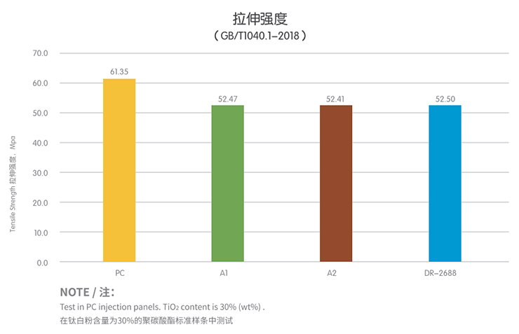 我們通過沖擊強度和拉伸強度等聚碳酸酯制品的力學性能,來反映DR-2688對聚碳酸酯體系的抗降解能力,聚碳酸酯制品的力學性能表現越優異,則鈦白粉對聚碳酸酯體系的抗降解能力越強。