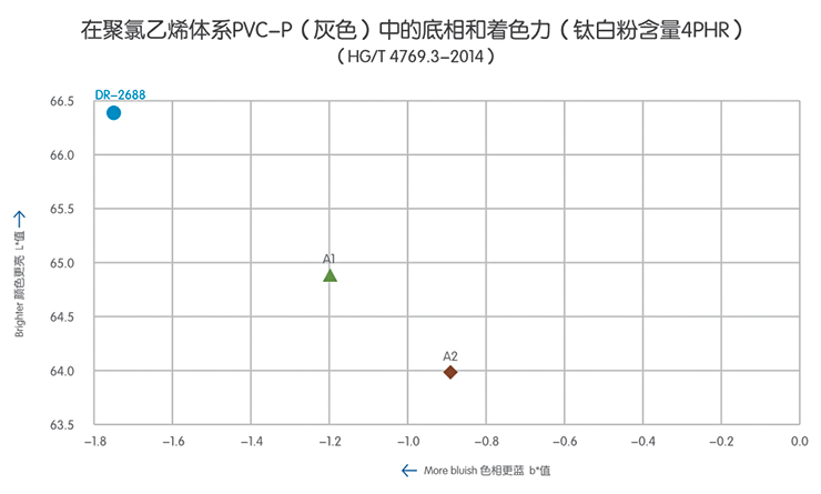 ■ 得益于優秀的雜質含量控制技術、強烈的藍底相和杰出的分散性,DR-2688的色相表現接近于優秀的氯化法產品水平,在塑料中具有明亮的帶藍相的白度。