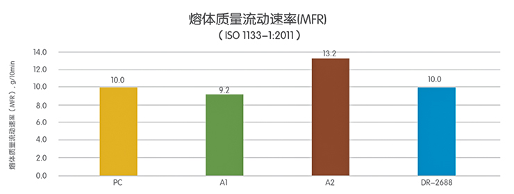 ■ 得益于DR-2688特殊的表面處理工藝以及杰出的分散性,DR-2688具有優異的MFR,在聚碳酸酯體系應用領域極具競爭力。
