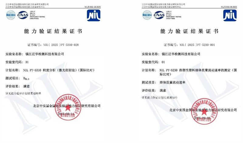 近日,鎮江泛華檢測科技有限公司(以下簡稱"泛華檢測")近日連續通過兩項由北京中實國金國際實驗室能力驗證研究有限公司實施的能力驗證計劃,分別獲得"粒度分析(激光衍射法)"(NIL(2025)PT-5310-028)和"熱塑性塑料熔體質量流動速率的測定"(NIL PT-5230)"滿意"結果證書,再次彰顯其在材料檢測領域的專業技術實力與行業領先地位。